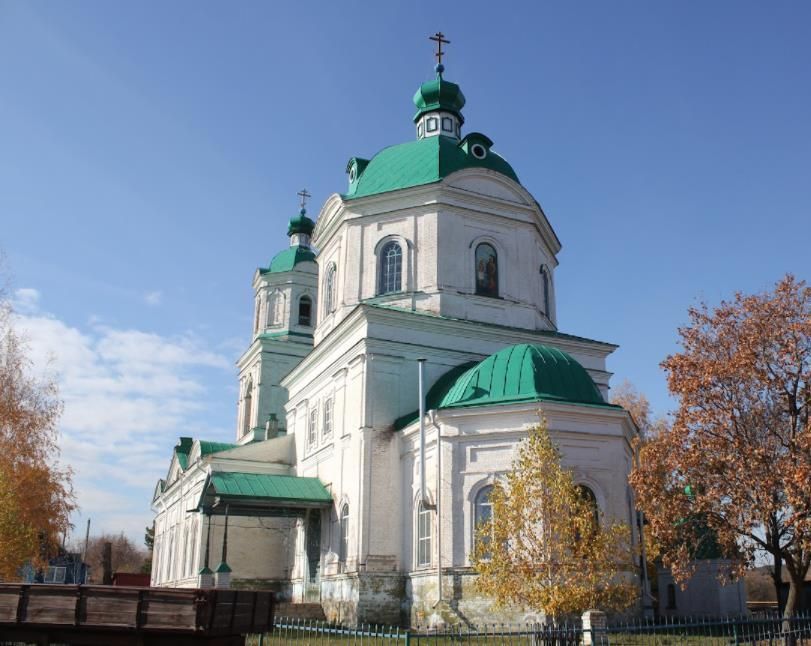 1. Градостроительная охрана1.1. - местоположение объекта у пересечения улиц Школьная и Комсомольская; в центральной части села;- композиционная значимость объекта в структуре окружающей застройки – высотная доминанта;- габариты и силуэт на период создания объекта – XIX в.;- секторы и направления видовых раскрытий с улиц Школьная и Комсомольская.2. Архитектурная охрана (экстерьер)2.1. Объемно-пространственная композиция на дату строительства объекта – XIX в.:- выстроенные по одной оси с запада на восток притвор – трапезная – храмовый четверик – алтарная апсида. Основной храмовый четверик выстроен в 2 яруса с восьмигранным барабаном. Колокольная трехъярусная.2.2. Крыши – конфигурация на дату строительства XIX в.:- двускатный навес с лучковым вырезом в составе входных групп с запада, севера и юга;- двускатная крыша трапезной с выделением кровли треугольных и лучковых фронтонов;- восьмискатный купол с арочными слуховыми окнами на восьмигранном барабане основного храмового четверика;- пятискатная конха алтарной апсиды;- восьмискатный купол колокольни. Отметки венчающих карнизов всех объемов храма. Кровли: материал – фальцевая кровля из металлических листов навесов, крыши трапезной, храмового четверика и апсиды; чешуйчатое металлическое покрытие куполов храмового четверика и колокольни.2.3. Отделка фасадной поверхности на дату строительства – XIX в.:- отделка фасадов лицевым кирпичом с последующей окраской в белый цвет.2.4. Характер архитектуры фасадов:2.4.1. Конфигурация и местоположение оконных проемов в плоскости фасадов на дату строительства - XIX в.: - арочные оконные проемы в обрамлении тонким наличником с замковым камнем в плоскости фасадов трапезной, первого яруса храмового четверика и апсиды, а также восьмигранного барабана храмового четверика;- парные оконные проемы с лучковым завершением во втором ярусе храмового четверика и первом ярусе колокольни;- сквозные арочные проемы второго и третьего яруса колокольни в обрамлении архивольтом с замковым камнем.Материал заполнения оконных проемов – дерево. Конфигурация и расположение глухих проемов в плоскости фасадов второго яруса колокольни, барабана четверика и алтарной апсиды.2.4.2. Архитектурное решение входных групп с запада, севера и юга:- двускатный навес с килевидным вырезом под металлической кровлей;- резные декоративные элементы в пространстве килевидного выреза;- фигурные опоры навеса;- двустворчатые металлические двери арочной конфигурации с сетчатым рисунком;- кованые ажурные боковые элементы под двускатным навесом.2.4.3. Архитектурно-художественное оформление фасадов на дату строительства – XIX в.:- тонкий пояс, выделяющий уровень цоколя;- парные гладкие пилястры, сдвинутые к углам притвора, второго яруса колокольни и первого яруса храмового четверика;- одиночные гладкие пилястры трапезной, расположенные в пространствах между оконными проемами;- прямоугольные выступы, расположенные над оконными проемами северного и южного фасада трапезной;- прямоугольные ниши над оконными проемами алтарной апсиды и под оконными проемами восьмигранного барабана основного храмового объема;- лучковые фронтоны в завершении объемов трапезной, барабана храмового четверика и восьмерика колокольни;- широкие антаблементы с элементами пилястр во фризовом поясе трапезной, апсиды, бара