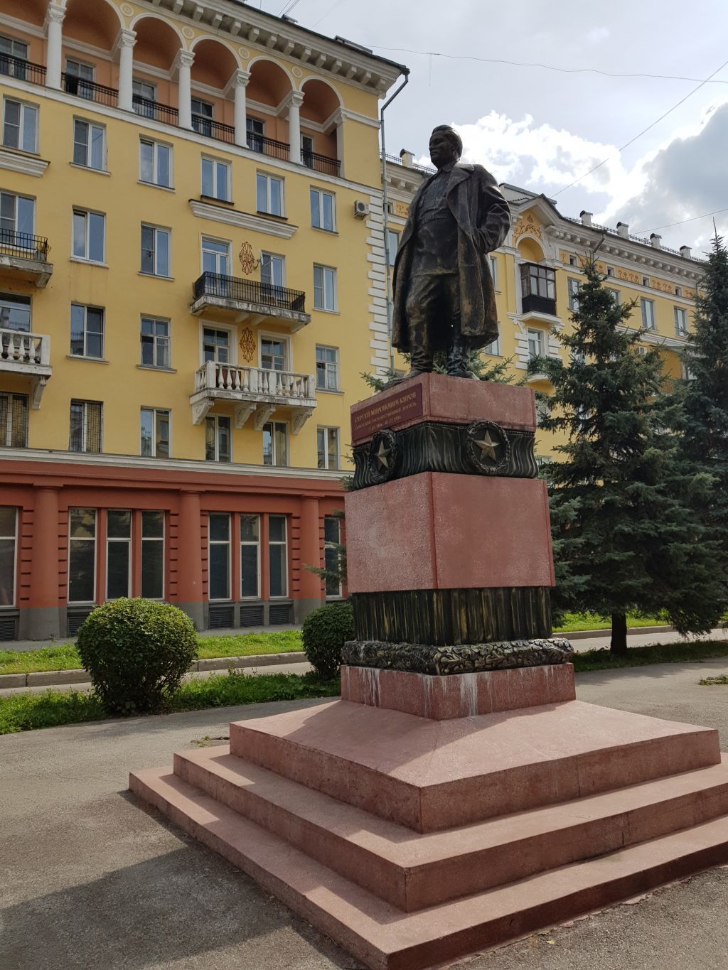 1. Местоположение памятника:- центральная аллея ул. Кирова;- ориентирован на ул. Кирова.2. Габариты и объем памятника:- трехступенчатый стилобат (4,1х4,1х0,1 м; 3,5х3,5х0,2 м; 2,75х2,75х0,15 м);- переходная площадка от ступеней к постаменту (2,75÷1,34х2,75÷1,34х0,15 м)- постамент (1,2х1,2х2,5 м);- фигура С.М. Кирова (2,5 м).3. Архитектурно-конструктивные элементы, материал памятника: - стилобат – бетон с отделкой камневидной штукатуркой с мраморной крошкой белого цвета под «красный гранит»; - постамент – бетон с отделкой камневидной штукатуркой с мраморной крошкой белого цвета под «красный гранит», декоративные элементы – цемянковый раствор;- фигура С.М. Кирова – армированный пескобетон.4. Декоративные элементы памятника:- верхняя часть постамента на каждой из четырех сторон декорирована рельефом с изображением советской символики: звезда в венке из лавровых листьев;- низ постамента «опоясан» рельефом в виде венка из дубовых листьев.5. Мемориальная доска с текстом «СЕРГЕЙ МИРОНОВИЧ КИРОВ СОВЕТСКИЙ ГОСУДАРСТВЕННЫЙ ДЕЯТЕЛЬ 27.03.1886 – 01.12.1934»