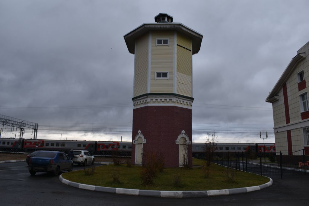 Водонапорная башня конца 1895 года с основанием бутовой кладки и деревянным навершием с декором из тесаного камня и резного дерева