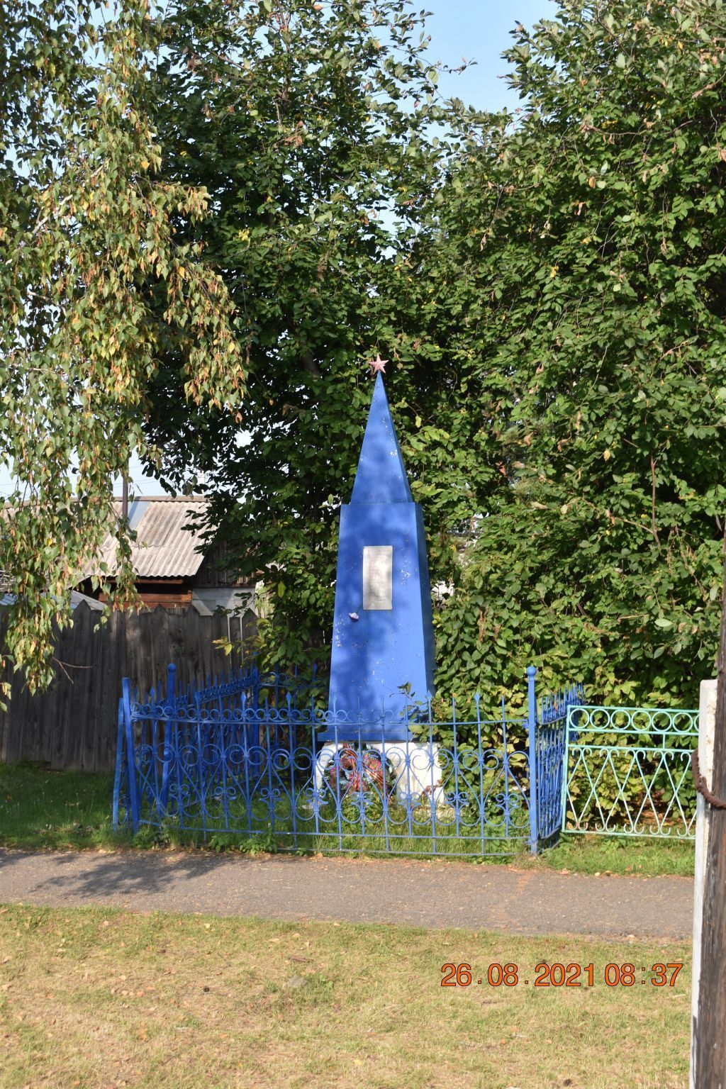 1. Захоронение.2. Композиционное и пространственное решение памятника.3. Габариты и объем памятника:- ограждение (2,5×3,0 м);- основание (1,4×1,4×0,2 м);- постамент (1,2×1,2×0,4 м);- обелиск в виде усеченной четырехгранной пирамиды (1,0×1,0×2,0 м); - обелиск в виде трехгранной пирамиды (0,4×0,4×1,0 м);4. Конструктивные элементы, материал памятника:- ажурное ограждение – метал;- основание - бетон- постамент - бетон- обелиск в виде усеченной четырехгранной пирамиды - метал; - обелиск в виде трехгранной пирамиды - метал; - стилобат – бетон.5. Декоративные элементы памятника:- металлическая красная пятиконечная звезда наверху обелиска. 6. Содержание информационной надписи на металлической мемориальной табличке на лицевой стороне обелиска: «Здесь, 18 октября 1918 года колчаковскими бандами, были расстреляны Выгузов Н.Д., Волобуев, Голубев Н., Дожморов Т., Конев И.С., Козин, Колев, Малахов Н.П., Прокопенко П.Т., Печенкин П., Савин Г., Тарасов Н.Г., Шумилов Н., Чоботов М.А., Чоботов Н.Т.»