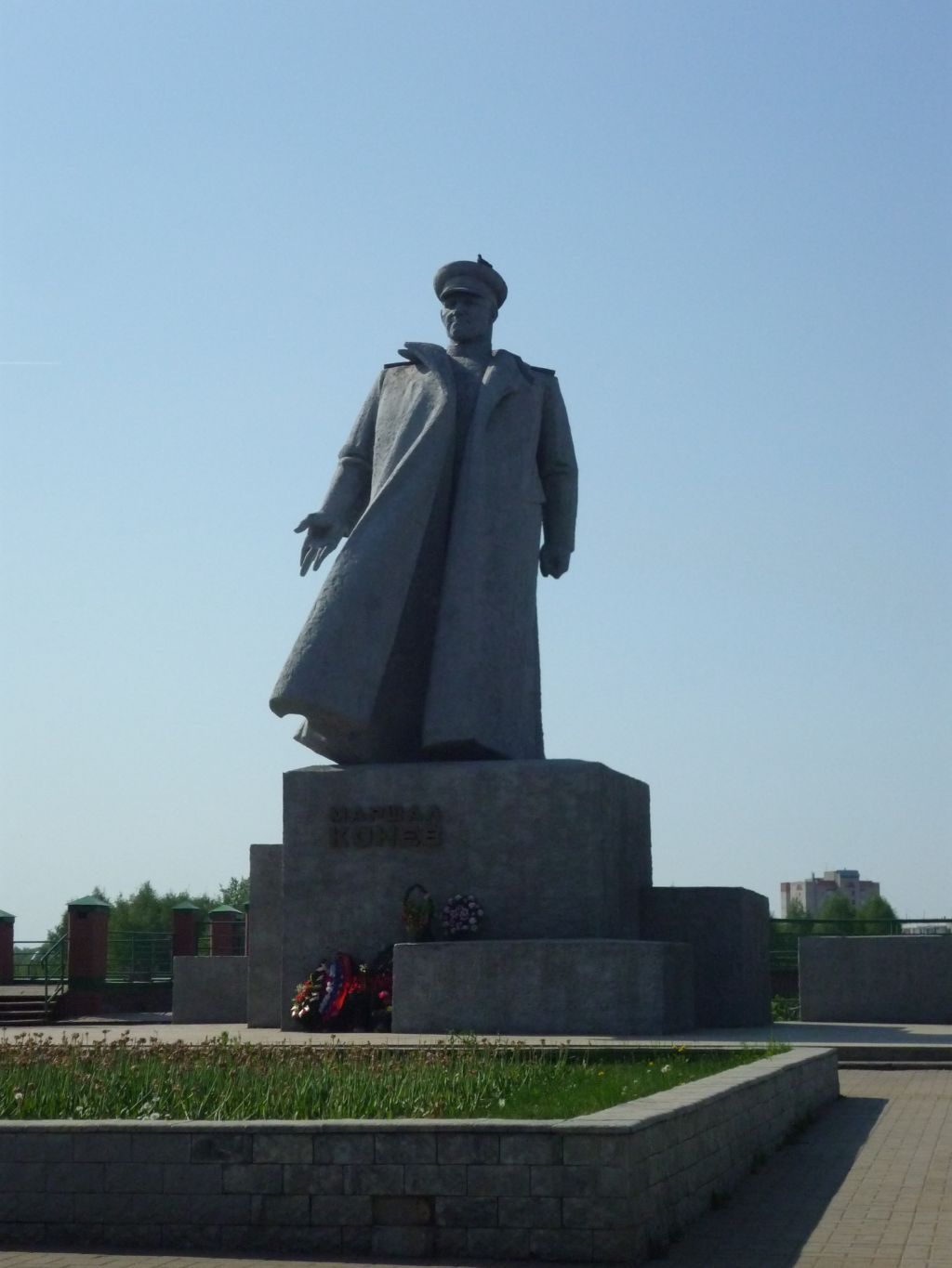 1. Градостроительные характеристики Памятника: местоположение Памятника: юго–западная часть площади Маршала Конева.2. Объемно-пространственная композиция Памятника: осевое (ось «север-юг») размещение сориентированной на север скульптуры на постаменте в виде сгруппированных объёмов разно размерных параллелепипедов из бетона.3. Композиция и архитектурно-художественное оформление элементов Памятника:3.1. Скульптура – сюжет скульптуры, изображающий маршала И.С. Конева в полный рост в распахнутой шинели закрывающей ноги, полы которой развивает ветер, дующий с левой стороны, на голове надета фуражка. Левая рука маршала сжата в кулак, правая откинута в сторону раскрытой ладонью.3.2. Постамент – постамент, представляющий из себя сгруппированные параллелепипеды из бетона серого цвета. На центральном параллелепипеде под скульптурой надпись золотыми буквами Маршал Конев.