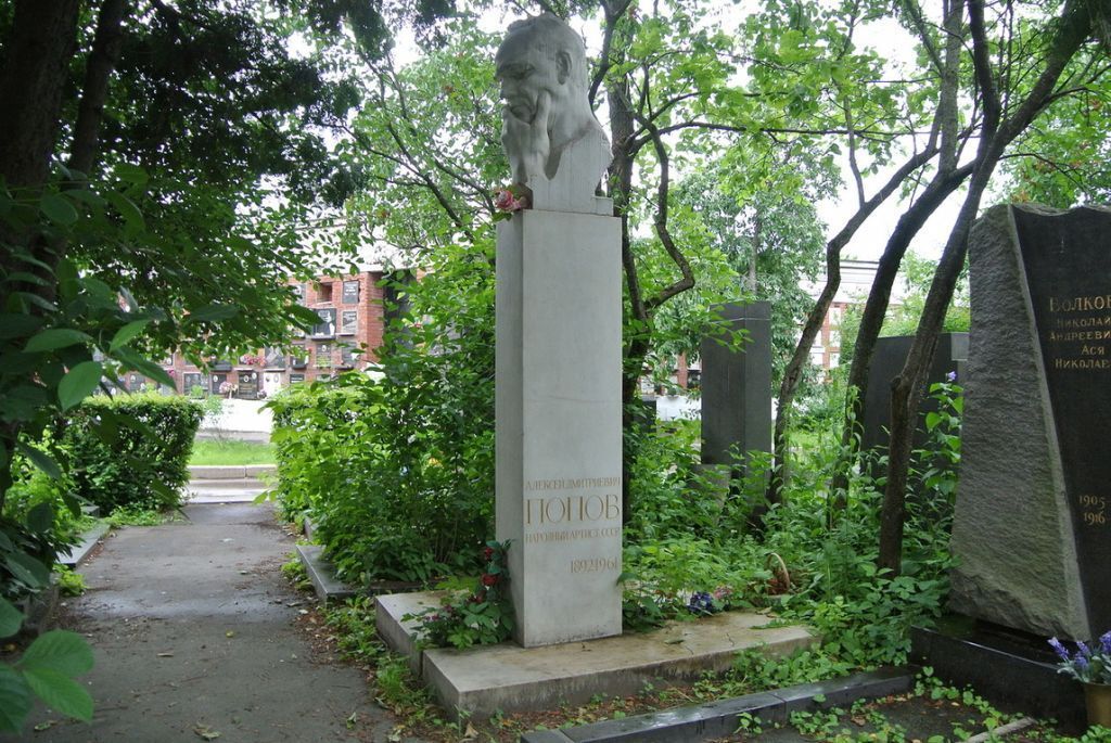 местоположение надгробия на могиле русского и советского актера и театрального режиссера, педагога, теоретика театра, народного артиста СССР Алексея Дмитриевича Попова (1892–1961), 1965 года, скульптор Е.Ф.Белашова, архитектор В.Л.Воскресенский, на \"новой\" территории Новодевичьего кладбища, участок № 8, ряд № 12 (согласно приложению к настоящему предмету охраны);объемно-пространственная композиция и архитектурно-художественное оформление надгробия 1965 года, представляющего собой беломраморный скульптурный портрет-бюст артиста, установленный на высоком прямоугольном в плане постаменте, включая основание из двух различных по размеру прямоугольных плит белого мрамора с широким швом между ними, над которым в месте соединения плит расположен памятник, в том числе габариты и высотные отметки (согласно приложению к настоящему предмету охраны);конструкция, материал (мрамор), характер и виды обработки поверхностей (шлифовка, гравировка);шрифтовая композиция с памятной надписью: \"АЛЕКСЕЙ ДМИТРИЕВИЧ ПОПОВ НАРОДНЫЙ АРТИСТ СССР 1892–1961\", выгравированная на северной стороне постамента внизу, включая технику нанесения (контррельеф), характер и покрытие (золочение) шрифта, колористическое решение (согласно приложению к настоящему предмету охраны).Изменение предмета охраны может быть осуществлено в порядке и случаях, предусмотренных законодательством об объектах культурного наследия.