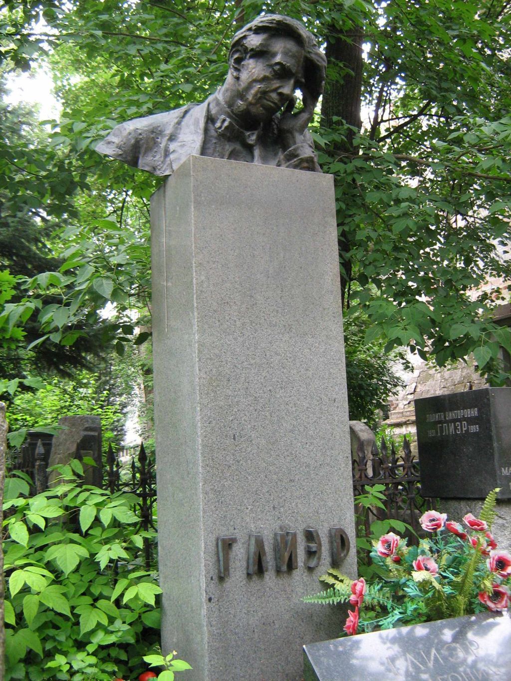 местоположение могилы с надгробием 1961 года, расположеннойна \"старой\" территории Новодевичьего кладбища на участке № 3, ряд 63 (согласно схеме предмета охраны);объемно-пространственная композиция и архитектурно-художественное оформление памятника 1961 года, включая высокий прямоугольный постамент, прямоугольную плиту-основание с большим лицевым выпуском и ступенькой, бронзовый бюст – скульптурный портрет композитора, ограждение захоронения гранитным бортом (согласно схеме предмета охраны), в том числе габариты и высотные отметки;конструкция, материал (бронза, гранодиорит, гранит), характер и виды обработки (фактура) поверхностей (гладкая шлифовка, полировка, литье);шрифтовая композиция на лицевой стороне постамента с надписью: \"ГЛИЭР\", включая технику нанесения (рельеф), материал (бронза), характер и покрытие шрифта, колористическое решение (согласно схеме предмета охраны);шрифтовая композиция на боковой (правой) стороне постаментав верхней части с памятной надписью: \"1875 1956 ВЕЛИКИЙ РУССКИЙ КОМПОЗИТОР ГОРДОСТЬ МУЗЫКАЛЬНОЙ КУЛЬТУРЫ РЕЙНГОЛЬД МОРИЦЕВИЧ ГЛИЭР\", включая технику нанесения (контррельеф), характер и покрытие (золочение) шрифта, колористическое решение (согласно схеме предмета охраны).Изменение предмета охраны может быть осуществлено в порядке и случаях, предусмотренных законодательством об объектах культурного наследия.