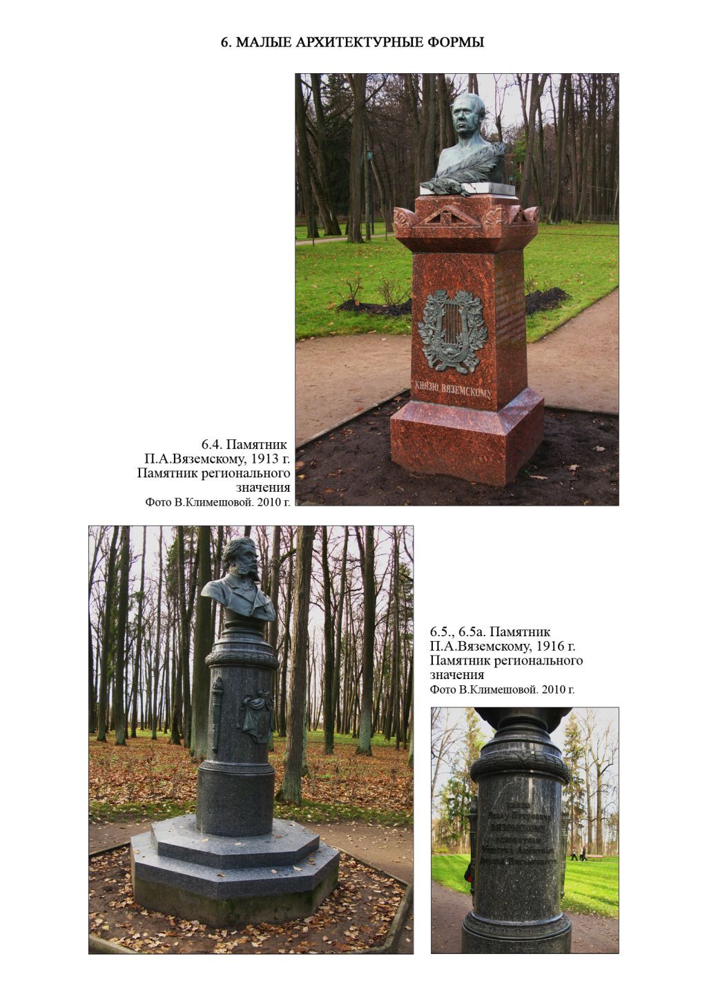 1. Ансамбль:местоположение памятников в парке усадьбы \"Остафьево\" (Вяземских) (согласно приложению к настоящему предмету охраны); объемно-пространственная композиция и архитектурно-художественное оформление памятников в парке усадьбы \"Остафьево\" (Вяземских), в том числе габариты и высотные отметки.2. \"Памятник А.С.Пушкину\" (1913 год) (г. Москва, поселение Рязановское, село Остафьево):местоположение памятника А.С.Пушкину 1913 года в парке усадьбы \"Остафьево\" (Вяземских) (согласно приложению к настоящему предмету охраны); планировочная структура памятника: площадка, дорожка и цветники; объемно-пространственная композиция и архитектурно-художественное оформление памятника А.С.Пушкину 1913 года, представляющего собой статую А.С.Пушкина (копия скульптора А.М.Опекушина), двухступенчатое основание с четырьмя связанными венками, постаментом в виде усеченной пирамиды, с бронзовым трапециевидным барельефом (изображение интерьера Овального зала Остафьевского дома, сидящий на стуле А.С.Пушкин), бронзовыми фигурами двух парящих Слав с трубой и пером, держащихся за венок, и бронзовым пологом с орнаментом, в том числе габариты и высотные отметки (согласно приложению к настоящему предмету охраны); конструкция, материал (бронза, гранит), характер и виды обработки поверхностей (литье, полировка, гравировка); шрифтовые композиции: \"ОНЪ МЕЖДУ НАМИ ЖИЛЪ.\" (под барельефом); \"ЗДРАВСТВУЙ, ПЛЕМЯ МЛАДОЕ, НЕЗНАКОМОЕ!\" (на левой грани пьедестала); \"Я БЫЛЪ РОЖДЕНЪ ДЛЯ ЖИЗНИ МИРНОЙ, ДЛЯ ДЕРЕВЕНСКОЙ ТИШИНЫ; ВЪ ГЛУШИ ЗВУЧНѢЕ ГОЛОСЪ ЛИРНОЙ, ЖИВѢЕ ТВОРЧЕСКIЕ СНЫ\" (на правой грани пьедестала), \"ПУШКИНУ\" (на лицевой грани верхней ступени плинта), включая технику нанесения (контррельеф), характер и оформление шрифта, колористическое решение (согласно приложению к настоящему предмету охраны).3. \"Памятник Жуковскому\" (1913 год) (г. Москва, поселение Рязановское, село Остафьево):местоположение памятника В.А.Жуковскому 1913 года в парке усадьбы \"Остафьево\" (Вяземских) (согласно приложению к настоящему предмету охраны); планировочная структура памятника: площадка, дорожка и цветники; объемно-пространственная композиция и архитектурно-художественное оформление памятника В.В.Жуковскому 1913 года, представляющего собой обелиск на квадратном плинте, установленном на постамент с медальоном с горельефным портретом В.А.Жуковского, а также верхнем основании пирамидальной формы из двух блоков, выполненный из серого шлифованного гранита, с бронзовыми рельефными фигурами лебедей, и нижним основанием квадратной формы из серого шлифованного гранита, состоящий из четырех блоков, в том числе габариты и высотные отметки (согласно приложению к настоящему предмету охраны); конструкция, материал (сплав на основе меди, бронза, гранит), характер и виды обработки поверхностей (литье, шлифовка, гравировка); шрифтовые композиции: \"ЖУКОВСКОМУ.\" (на передней прямоугольной грани постамента); выгравированная цитата из стихотворения В.А.Жуковского \"Царскосельский лебедь\" (бронзовая доска на задней грани кубического основания): \"ЛЕБЕДЬ БЛАГОРОДНЫЙ ДНЕЙ ЕКАТЕРИНЫПѢЛЪ, ПРОЩАЯСЬ СЪ ЖИЗНЬЮ, ГИМНЪ СВОЙ ЛЕБЕДИНЫЙ; А КОГДА ДОПѢЛЪ ОНЪ – НА НЕБО ВЗГЛЯНУВШИИ КРЫЛАМИ СИЛЬНО ДРЯХЛЫМИ ВЗМАХНУВШИКЪ НЕБУ, КАКЪ ВО ВРЕМЯ ОНОЕ БЫВАЛО,ОНЪ СЪ ЗЕМЛИ РВАНУЛСЯ… И ЕГО НЕ СТАЛОВЪ ВЫСОТѢ…И НАВЗНИЧЪ СЪ ВЫСОТЫ УПАЛЪ ОНЪ;И ПР