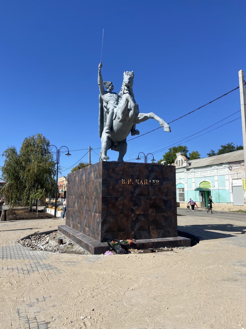 1.Градостроительные характеристики:1.1- местоположение объекта культурного наследия в планировочной структуре городской застройки: -памятник расположен в центре г. Пугачев в сквере Победы, в границах улиц Бубенца, Топорковская, Пушкинская и Революционный проезд.2.Композиционное и архитектурно-художественное оформление монумента:2.1- схема размещения элементов монумента: Композиционная скульптура (А)А – Композиционная скульптура «Чапаев В. И. на коне»:А1 – Памятник Чапаеву В.И. Скульптура выполнена с портретным сходством. Шашку всадник держит в правой руке. Левой рукой он держит повод коня. Ноги Чапаева В.И. находятся в стременах. Оба сапога левые. Одет Чапаев В.И. в бурку, папаху и военную форму 1920-х годов. А2 – Скульптура «Конь». Конь стоит на дыбах. Имеет две опоры – задние ноги и хвост. Изображен в амуниции. 2.2- объемно -пространственное решение Бетонное изваяние изображает всадника с шашкой наголо на коне, вставшем на дыбы.3.Местоположение, архитектурное оформление элементов:3.1- Композиционная скульптура «Памятник В.И. Чапаеву» - Колористическое оформление: серый цвет.