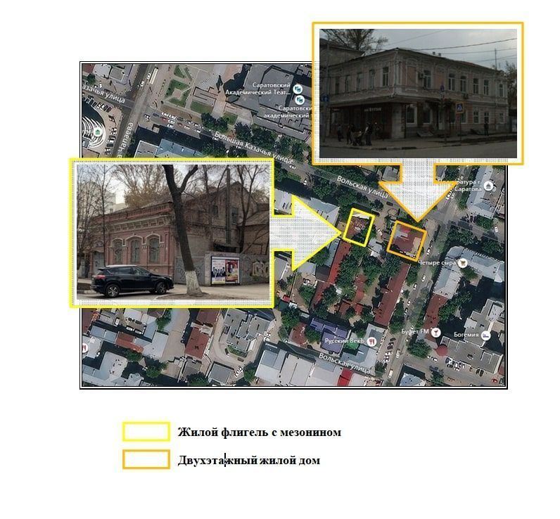 1. «Домовладение О.Л. Арленинова», кон. XIX – нач. ХХ в. (Саратовская область, г. Саратов, ул. Большая Казачья, 41 (литеры А, Б)1.1.Месторасположение ансамбля в планировочной структуре квартала:в квартале, ограниченном улицами Большая Казачья, Вольская, проспект им. Петра Столыпина, им. В.И. Чапаева, по нечетной стороне красной линий застройки улиц Большая Казачья и Вольская. 1.2.Взаиморасположение строений ансамбля (литера А, литера Б) на занимаемой территории.Предмет охраны:строения, входящиев состав ансамбля 1.3.Строения,входящиев состав ансамбля: 1.3.1.Двухэтажный жилой дом, последняя четверть XIX в. (литера А) – эклектичное каменное здание с деревянной пристройкой - галереей со стороны двора. 1.3.2Жилой флигель с мезонином, 1898 г. (литера Б) – эклектичное каменное строение с деревянным мезонином, обращенным в сторону двора, украшенным деревянной резьбой. 2. «Двухэтажный жилой дом», последняя четверть XIX в (Саратовская область, г. Саратов, ул. Большая Казачья, д. 41 (литера А)2.1.Месторасположение Объекта впланировочной структуре квартала:в квартале, ограниченном улицами БольшаяКазачья, Вольская, проспект им. Петра Столыпина, им. В.И. Чапаева, по нечетным сторонам красных линий застройки улиц Большая Казачья и Вольская. 2.2.Объемно - пространственные параметры исторического строения:двухэтажное с подвалом строение со скатной вальмовой кровлей, состоящей из каменной части и деревянной пристройки-галереи со стороны двора;исторические параметры строения в габаритах наружных стен и высотных отметокконьков кровли, датируемых кон. ХIХ в.основные элементы планировки – наружные стенысоконнымии двернымипроемами (месторасположение), лестничная клетка(параметры иместорасположение). 2.3Стилистика, материал стен, характер наружной отделки здания:стилистическое решение фасадов–эклектичное строениесосредней плотностью и насыщенностью кирпичного декора;наружные стены из кирпича;стены пристройки - галереи – кирпичные столбы с деревянными заполнениями между ними;характер наружной отделки – штукатурное покрытие, окраска. 2.4.Северный (по ул. Большая Казачья) фасад.Асимметричное композиционное решение фасада;8 (восемь) световых осей; количество ирасположение проемов (в т.ч. заложенных);ленточный руст первого этажа;архитектурные детали . 2.5.Восточный (по ул. Вольская) фасад.Асимметричное композиционное решение фасада;6 (шесть) световых осей– количество и расположение оконных проемов;рустованный первый этаж;архитектурные детали. 2.6.Дворовый (южный) фасад.количество ирасположение оконных проемов;характер наружной отделки – деревянная обшивка в уровне второго этажа.архитектурные детали. 2.7.Архитектурныеэлементы и детали северного (по ул. Большая Казачья) фасада.Торцевой (северный)фасад пристройки - галереи. Пилястры, фланкирующие торцевой фасад пристройки - галереи, в уровне первого этажа - рустованные, выше - профилированные со стилизованными капителями. Оконные проемыпервого этажа пристройки-галереи – параметры, форма, оформление.лучковые завершения;обрамление рамочными наличниками;подоконная тяга. Оконный проем второго этажа пристройки - галереи – параметры, форма, оформление.лучковые завершения;обрамление рамочными наличниками с замковыми камнем по центральной оси и ушками, серьги;подоконный фартук. Междуэтажный карниз с поребриком. Венчающий 
