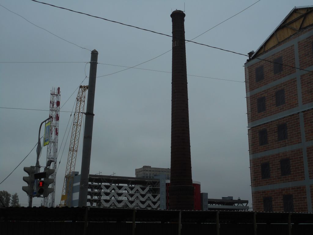 Дымовая кирпичная, круглая в плане, с цокольной частью, завершающейся карнизом с удлинёнными стилизованными зубчиками.