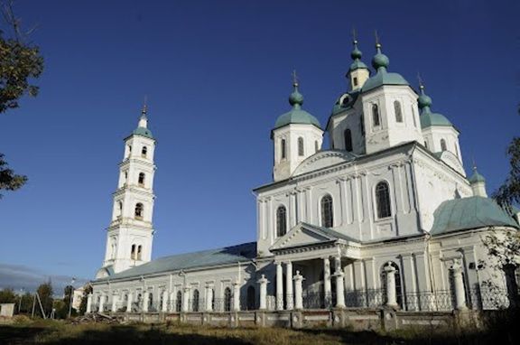 -градостроительные и композиционные характеристики в структуре исторической регулярной застройки города Елабуга (формирует силуэт улицыНабережная и играет значимую роль в панорамном восприятии исторического внутригородского пространства), территория ансамбля в исторически сложившихся границах;-объёмно-пространственная и планировочная структура: двухсветный объем че верика, пятиглавый (завершения крупные, восьмигранные); с востока к основному объему примыкает трехапсидный, полукруглый алтарь, покрытый конхой в завершении небольшая луковичная главка на граненом барабане, с запада к четверику примыкает удлиненный (в 12 окон) объем трапезной с антресольным этажом на 4 оконных оси, под трехскатной кровлей, к последнему пятиярусная колокольня с открытой папертью, навес в виде портика со стилизованными колоннами с утонением и треугольным фронтоном, декор профилированные тяги и сухарики; аналогичные портики у южных и северных входов четверика, на входах кованные ажурные решетки, каменная ограда с металлической решеткой в колоннах стилизованных по дорический ордер, завершающихся небольшими шарами на прямоугольном основании на накрывной плите; ворота решены в виде триумфальной арки, отчасти дублирующей боковые по тики; ворота с пилонами и колоннами дорического ордера, верхнюю часть поддерживают стилизованные валюты, завершают небольшой купол и по краям четыре остроконечные пирамидки.-конструктивная схема: подлинные кирпичные стены; кирпичные сводчатые перекрытия; кирпичные перемычки проемов;-историческая конфигурация, геометрия и конструктивное решение крыш и перекрытий куполов, материал кровли - листовое кровельное железо с двойным ф ьцем, историческая система водоотведения;-композиция и архитектурное решение фасадов: стены оштукатурены, окрашены в белый цвет, стены храма членятся пилястрами, на втором ярусе стилизованы под ионический ордер, оконные проемы арочные в профилированных наличниках с подоконными нишами и гирляндами в завершении окон, по оси сторон главного объема и первого яруса колокольни лучковые фронтоны, повторяют декор входных портиков, междуярусного пояса и карнизов на фасадах трапезной и колокольни, сандрики алтарных окон повторяются над всеми окнами трапезной, декор барабанов четверика простой, центральный барабан (чуть больше) и угловые имеют восемь граней, по всем граням, имеют световые узкие оконные проемы с арочными перемычками, каждый проем помещен в прямоугольную нишу, по центральной оси замковый камень, на гранях кровли центрального барабана, расположенные по сторонам свёта, имеются световые круглые люкарны, завершаются главы луковичными главками, центральная главка расположена на восьмигранном барабане, с арочными проемами по сторонам света, по верху всех фасадов четверика проходит профилированный карниз, фасады алтаря завершает такой же профилированный карниз, все ярусы колокольни граненой формы, к верху переходит в утонение, со сквозными арочными проемами, второй ярус со спаренными проемами в арочной нише (по типу венецианского окна), ограждения деревянные, проемы оформлены профилированными наличниками, по оси проема пя ого яруса, замковый камень, каждая грань, расположенная по сторонам света, имеет по бокам пилястры, со стилизованными капителями, остальные грани с п