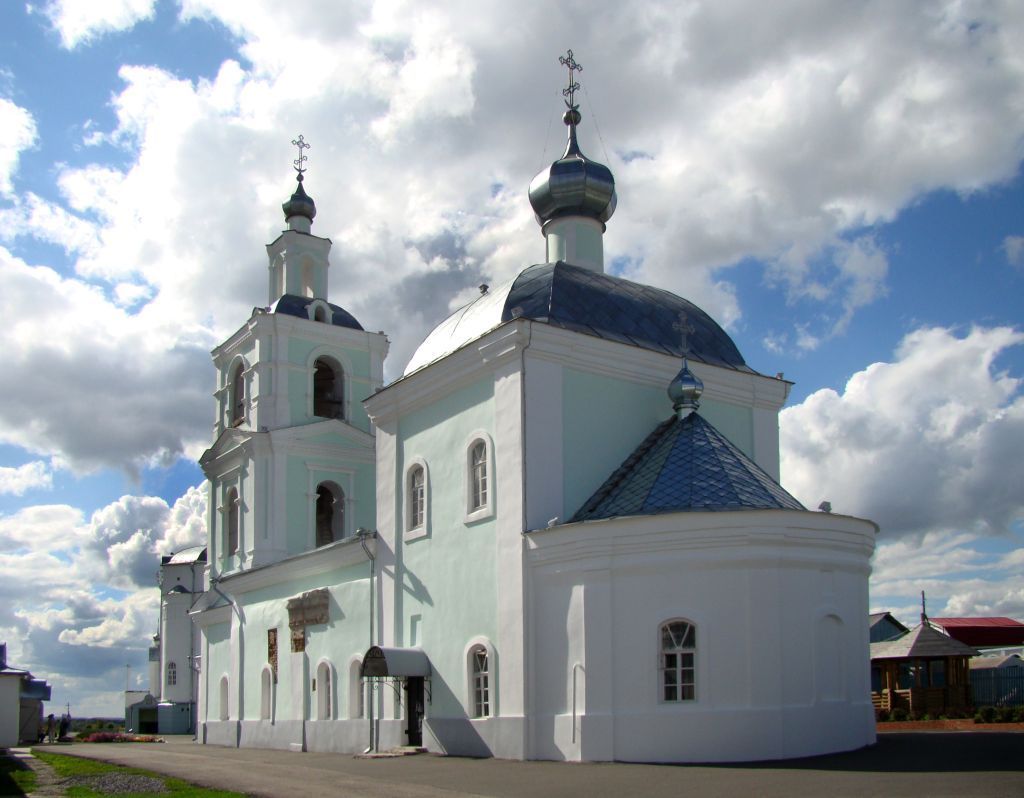 Градостроительные характеристики:местоположение здания в современных границах участка: расположен на западной окраине села, на территории монастырского комплекса, огороженного кирпичной стеной (фото 5);высотные габариты здания (фото 1 – 4);планировочная и объёмно-пространственная структура здания (в редакции конца XIX в.): традиционный трёхчастный храм трапезного типа, скомпонованный по оси восток-запад: основной двухсветный четверик, увенчанный главкой на глухой шейке, стоящей над покрытием свода, с востока - полукруглая апсида алтаря с конховым покрытием, с запада - трапезная с двускатных покрытием и четырёхъярусная колокольня, которую венчает главка ни глухой шейке. Алтарь и трапезная ниже объёма четверика и почти равны ему по ширине. К колокольне примыкает двускатный навес входа, опирающийся на колонны и увенчанный главкой на глухой шейке (фото 1-4).Инженерно-конструктивные характеристики:первоначальный материал стен (красный кирпич на известково-песчаном кладочном растворе, оштукатурены и окрашены) фото 1-4);своды: купольный четверика на парусах без барабана; конховый алтаря; цилиндрический трапезной; лотковый третьего яруса колокольни (фото 6-9);трёхступенчатая белокаменная солея с полукруглым амвоном в центре (фото 6);оконные проёмы полуциркульные и с лучковой перемычкой, арочный стеновой проём (фото 1-4, 6);первоначальный материал (дерево) и форма заполнения оконных и дверных проемов (расстекловка и профилировка) фото 2);материал и форма кровельного покрытия (гладкие металлические листы в форме ромбов с фальцевыми соединениями) фото 2, 3);лучковые фронтоны с полуциркульными окнами на колокольне (фото 1-4).Архитектурные характеристики: – стилистика – классицизм (фото 1-4); – композиция и архитектурно-художественное оформление фасадов (в редакции конца XVIII в.): гладкие лопатки (фото 1, 3, 10); рамочные наличники (фото 1-4, 10); многопрофильный карниз (фото 1-4, 10); профилированные сандрики-полочки, поддерживаемые пилястрами на консолях (фото 1-4); профилированные архивольты (фото 1-4); пилястры (фото 4,10); профилированные пояски, в верхней части колокольни – с бровками (фото 1-4); плоские портики из двускатных раскрепованных фронтонов с профилями и сухариками, опирающихся на плоские пилястры (фото 1, 4); архитектурно-художественное оформление интерьеров: лепной декор интерьеров: головки херувимов на тромпах и своде четверика, гирлянды по ребрам свода, тянутые профили по карнизам, рёбрам сводов, краям, профилированные круглые розетки, декоративных филёнок; клеевая роспись; чугунные плиты пола; деревянное ограждение хоров (фото 6 – 9, 11).