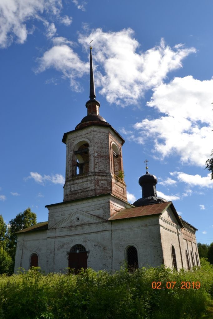 Градостроительное значение:- особая градостроительная (центральная) роль здания в формировании застройки исторической части города (Городища) – крепости, сооруженной на рубеже XIV-XV веков;- перспектива, визуальные точки обозрения и силуэт церкви: с ул. Горидище, вдоль ул. Набережной, с противоположного берега реки Сухоны, со стороны Советского пр., ул. Красной, пл. Коммуны; - роль здание как одной из высотных доминант в застройке набережной реки Сухоны.Объёмно-пространственная и конструктивная схема:- сильно вытянутое в плане с востока на запад одноэтажное здание, симметричное по продольно-осевой композиции, состоящее из: одноглавого квадратного в плане четверика храма с примыкающей с восточной стороны более узкой полукруглой апсидой, с западной стороны – узкой протяженной трапезной и паперти, служащей основанием колокольни с открытым ярусом звона, с примыкающими к ней с северной и южной сторон палатками;- исторические конструкции (тип, конструкции и материал):•фундамент*;•наружные и внутренние капитальные стены – кирпичные;•металлические связи;•перекрытия в исторических отметках: четверик храма, перекрытый сомкнутым восьмилотковым сводом, диагональные лотки, покоящиеся на тромпах; трапезная – коробовым сводом; апсида – полусомкнутым сводом; паперть – сомкнутым сводом; боковые палатки и колокольня – плоскими перекрытиями по деревянным балкам;•кирпичная внутристенная лестница, расположенная в толще северной стены паперти и ведущая на колокольню;•междуэтажная деревянная лестница, ведущая на ярус звона колокольни;•конструктивная схема и материал стропил (дерево);•историческая конфигурация кровель: четверик храма и паперть, покрытые четырёхскатными кровлями; ротонда, расположенная над четвериком храма, – купольной кровлей с изогнутыми гранями; апсида – полукруглой кровлей по типу вальмовой; трапезная и палатки – двускатными кровлями; ярус звона колокольни – восьмискатной кровлей; ротонда, расположенная над ярусом звона колокольни – купольной кровлей; свесы кровель, оформленные подзорами;•завершения: четверик храма, увенчанный главой с крестом, расположенной на восьмигранном барабане; колокольня, завершенная высоким шпилем с фигурной нижней частью, устроенным на восьмигранном барабане, и крестом;•покрытие кровель: фальцевое кровельное железо с покраской; историческое цветовое решение покрытия*;•полы: деревянные, дощатые, по деревянным балкам; в помещениях паперти и алтаря – вымостка белокаменными плитами (50х50 см);- размеры здания:•технология возведения: из большемерного кирпича 29х15х8 см (10к+10шв=89 см) на известковом растворе с затиркой швов под побелку;•основные габариты плана*: 35,0х11,0 м;•высотные отметки*;- характер и расположение входов в здание: через проём на западном фасаде паперти.Композиция и архитектурно-художественное оформление фасадов:- внешний облик исторического объёма здания и его частей, декоративное убранство фасадов:•цоколь, выделенный уступом от поверхности стен;•раскреповка стен северного и южного фасадов четверика храма вытянутыми вертикальными прямоугольными нишами с размещенными в них окнами; углы и простенки выступающих частей решены в виде пилястр, несколько меньшей ширины;•подоконный пояс северного и южного фасадов четверика храма;•горизонтальные прямоугольные ни