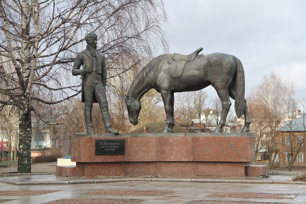 Градостроительное значение:- местоположение объекта в центральной исторической части г. Вологды - Город, на Кремлевской площади, на берегу реки Вологды;- роль памятника в пространственной композиции и планировочной организации Кремлевской площади;- видовые характеристики объекта с разных точек обзора: точки визуального восприятия памятника с ул. С. Орлова, проспекта Победы, с противоположного берега реки Вологда - Набережной VI Армии, с территории Кремлевской площади.Объемно-пространственная и конструктивная схема:- скульптурная композиция, состоящая из четырех фигур: в центре площадки - поэт К.Н. Батюшков и его конь, юго-западнее по отношению к памятнику К.Н. Батюшкову – скульптура девушки на постаменте, восточнее по отношению к памятнику К.Н. Батюшкову – скульптура богини Афины Паллады на постаменте:а) памятник К.Н. Батюшкову:- постамент памятника сложной формы, состоящий из двух оснований разных размеров; - скульптура К.Н. Батюшкова в полный рост, сжимающего в правой руке бумажный свиток и в левой руке – поводья, одетого в рубашку, поверх которой повязан шейный платок, жилет, брюки, заправленные в высокие сапоги, и сюртук, и коня с опущенной головой, с седлом со стременами, размещенных на невысоком основании, повторяющем форму постамента; - надпись на лицевом фасаде постамента: «Батюшкову от благодарных потомков»*; - конфигурация, размеры в плане и высота постамента; общие габариты, размеры скульптуры К.Н. Батюшкова и его коня;б) памятник девушке на постаменте:- скульптура сидящей босой девушки в сарафане, душегрее и с кокошником на голове, держащей в руках у лица свирель, на высоком постаменте, состоящем из двух оснований квадратной в плане формы, расположенной юго-западнее по отношению к памятнику К.Н. Батюшкову;- конфигурация, размеры в плане и высота постамента; общие габариты, размеры скульптуры;в) памятник богине Афине Палладе на постаменте:- скульптура богини Афины в хитоне и высоком шлеме, держащей в правой руке копье, левой рукой придерживающей круглый щит, на высоком постаменте, состоящем из двух оснований квадратной в плане формы, расположенной восточнее по отношению к памятнику К.Н. Батюшкову;- конфигурация, размеры в плане и высота постамента; общие габариты, размеры скульптуры;- материал конструкций: а) материал постаментов - полированный мрамор; б) материал скульптур – литая бронза.Историческая значимость:- скульптурная композиция, связанная с именем К.Н. Батюшкова – поэта и прозаика, сыгравшего значительную роль в становлении русской классической литературы.*включено на основе историко-архивных материалов.
