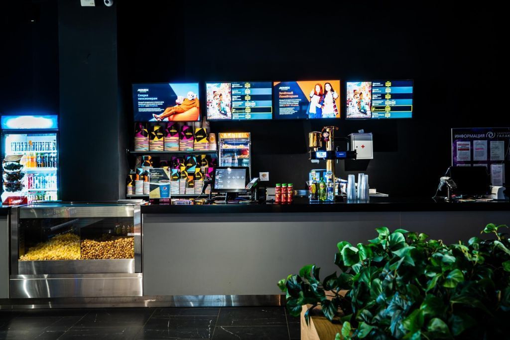 В фойе для посетителей работает кино бар самообслуживания с широким ассортиментом попкорна, чипсов, других снеков, а также различных горячих и холодных напитков.